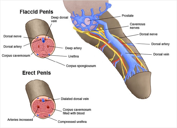 The cavernous nerves travel from the underside of the penis to the prostate. They regulate blood flow within the penis. In the flaccid state, relatively little blood flows in through the arteries and there is free outflow via the small veins exiting the spongy tissue just under the thick tunica (membrane surrounding the spongy tissue). During erection, the smooth muscle in the penis relaxes while the arteries widen to bring in more blood. This expands the three cylinders of erectile tissue in the penis, thus lengthening and enlarging the penis. The expansion of these cylinders compresses the small veins, reducing the outflow of blood.